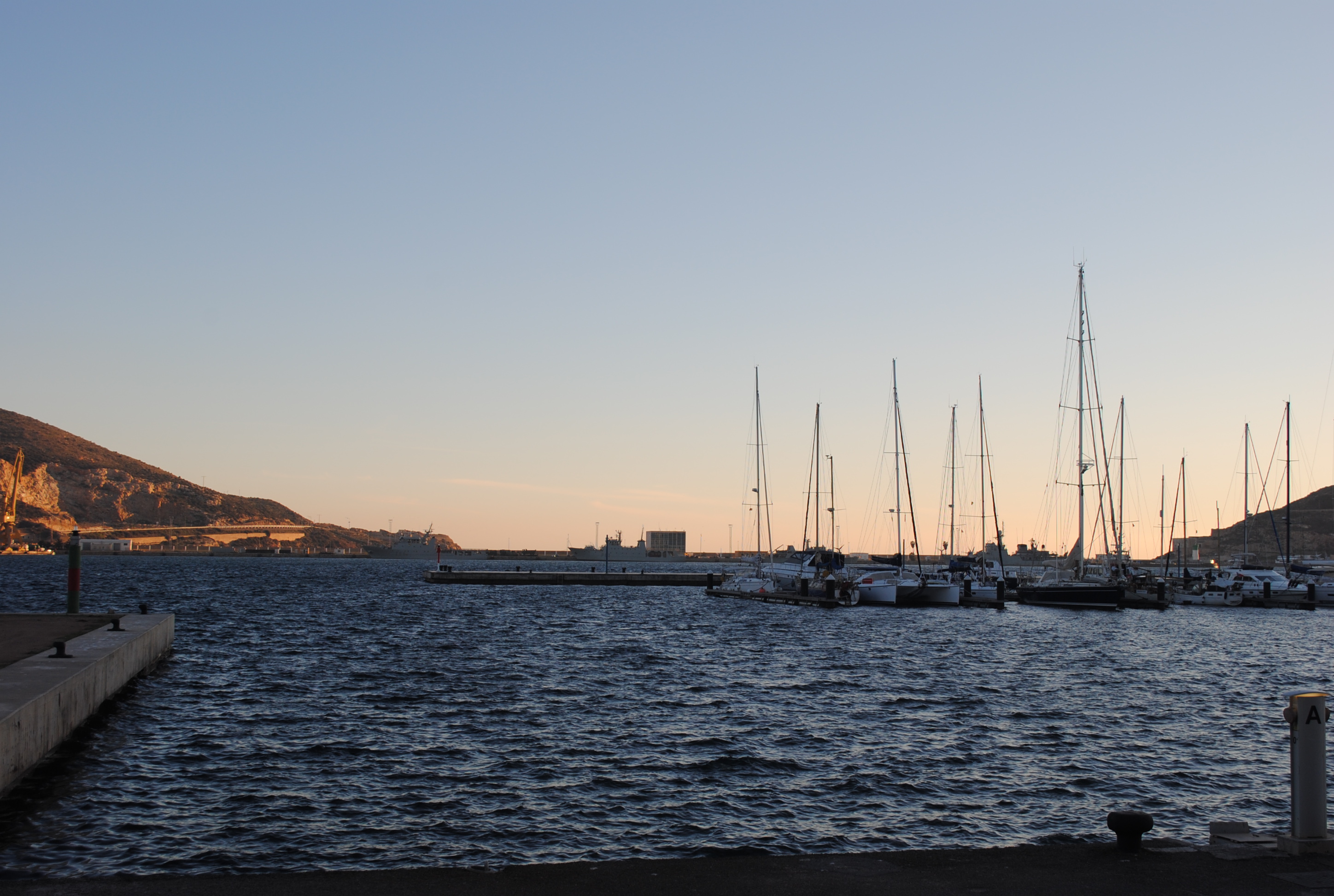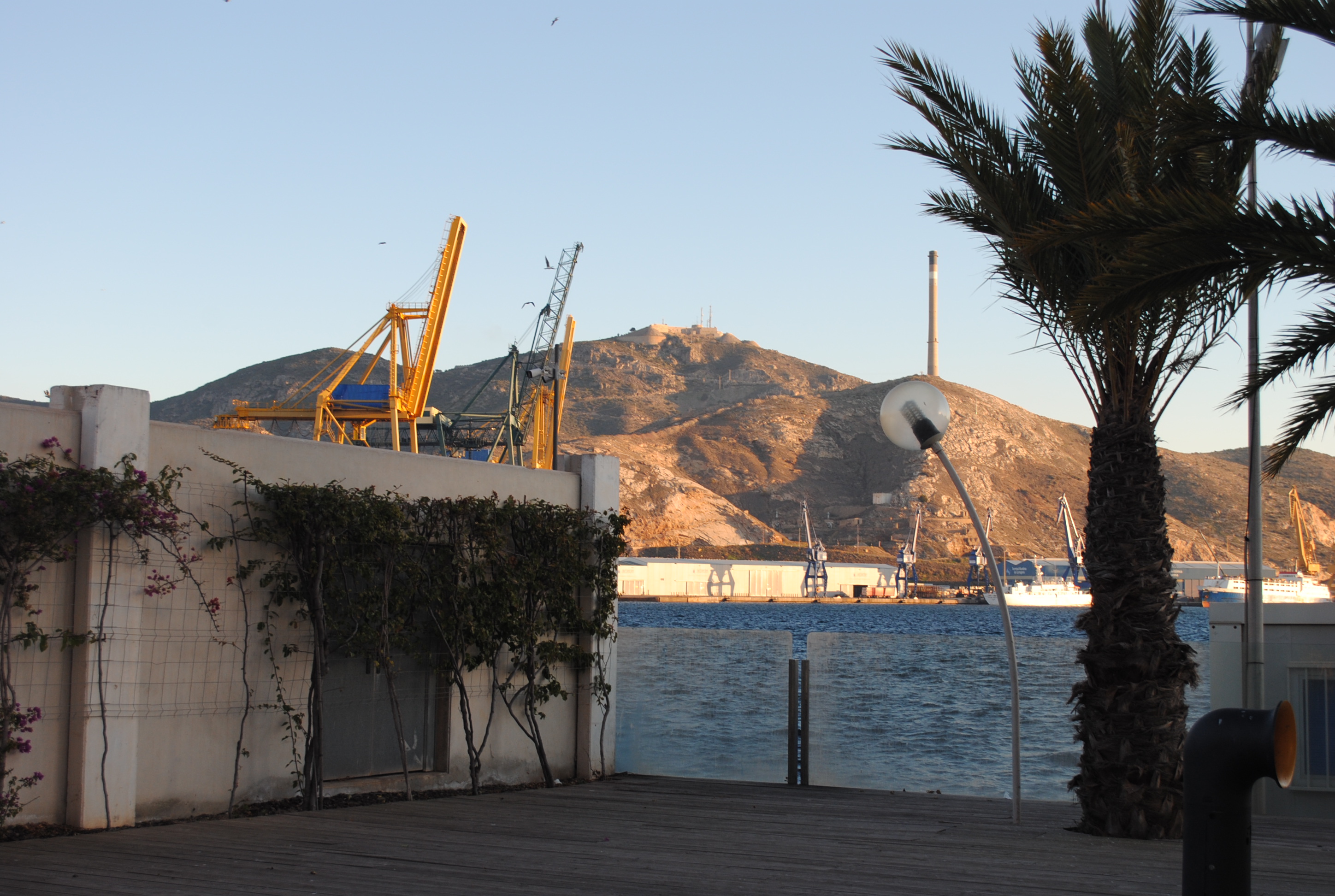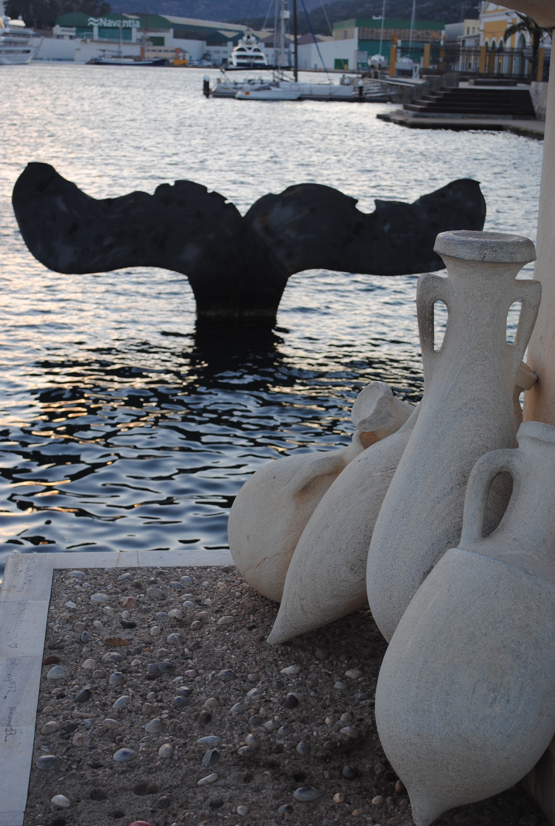 El puerto de Cartagena y la propia ciudad en sí está rodeada de colinas, lo que ha condicionado el paisaje actual y la historia misma (aunque esto lo desarrollaremos en otra entrada). De hecho, desde la propia carretera, en ningún momento ves el mar, puesto que estas colinas se alzaban ante la vista. En esta zona del puerto se encuentra ARQUA, así como, es dónde se coge el barco turístico. Al final del mismo se encuentra la famosa escultura de una cola de ballena; y al fondo, Navantia, importante industria de la ciudad dedicada a la construcción naval.