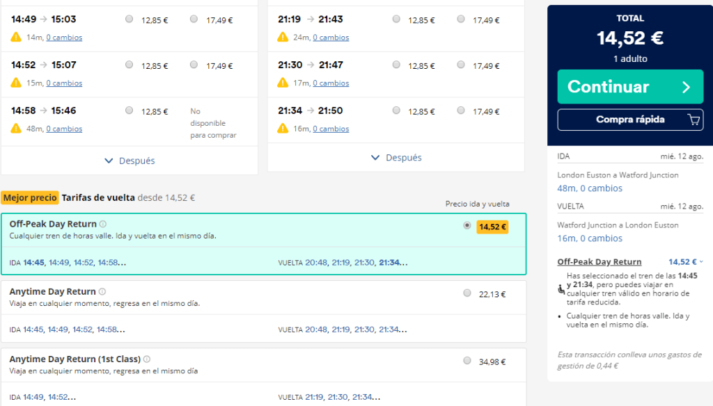 Os aconsejamos que compréis vuestros billetes desde la web oficial de Trainline antes de ir y si quieres acceder solo debes clicar aquí. La página web nos dejará seleccionar el lugar de origen y de destino, y la hora aproximada para llegar. Tan solo tendréis que darle a «siguiente». Para ahorrar unos cuantos euros, podéis darle a la modalidad de Off-Peak Day Return, para poder subir y bajar del tren en horario que no sea hora punta. Creedme, todo lo que podáis ahorrar, mucho mejor. Nosotros escogimos esta modalidad y no tuvimos ningún tipo de problema, por eso mismo os recomendamos esta opción.