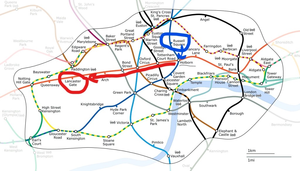 La cuestión se complica si tu punto de partida, es decir, tu parada de metro está en la línea de un color, pero vas a un metro de otro distinto. Eso significa que deberás hacer un cambio de línea. Un transbordo. ¡Pero no te preocupes! Solo deberás buscar en qué momento la línea del color de origen se cruza con la línea del color de llegada. En el punto que se crucen, debes bajarte y cambiar hacia otro de los vehículos del tren. Siguiendo el ejemplo anterior. Si estás en Russel Square (línea azul llamada Piccadilly Line) y quieres ir a Lancaster Gate (línea roja llamada Central Line), el punto, la parada de metro dónde se cruzan ambas es Holborn (ahí se cruzan la línea roja y azul). Por lo tanto, te subes en Russel Square, te bajas en Holborn y ahí caminas hacia el metro en dirección Lancaster Gate.