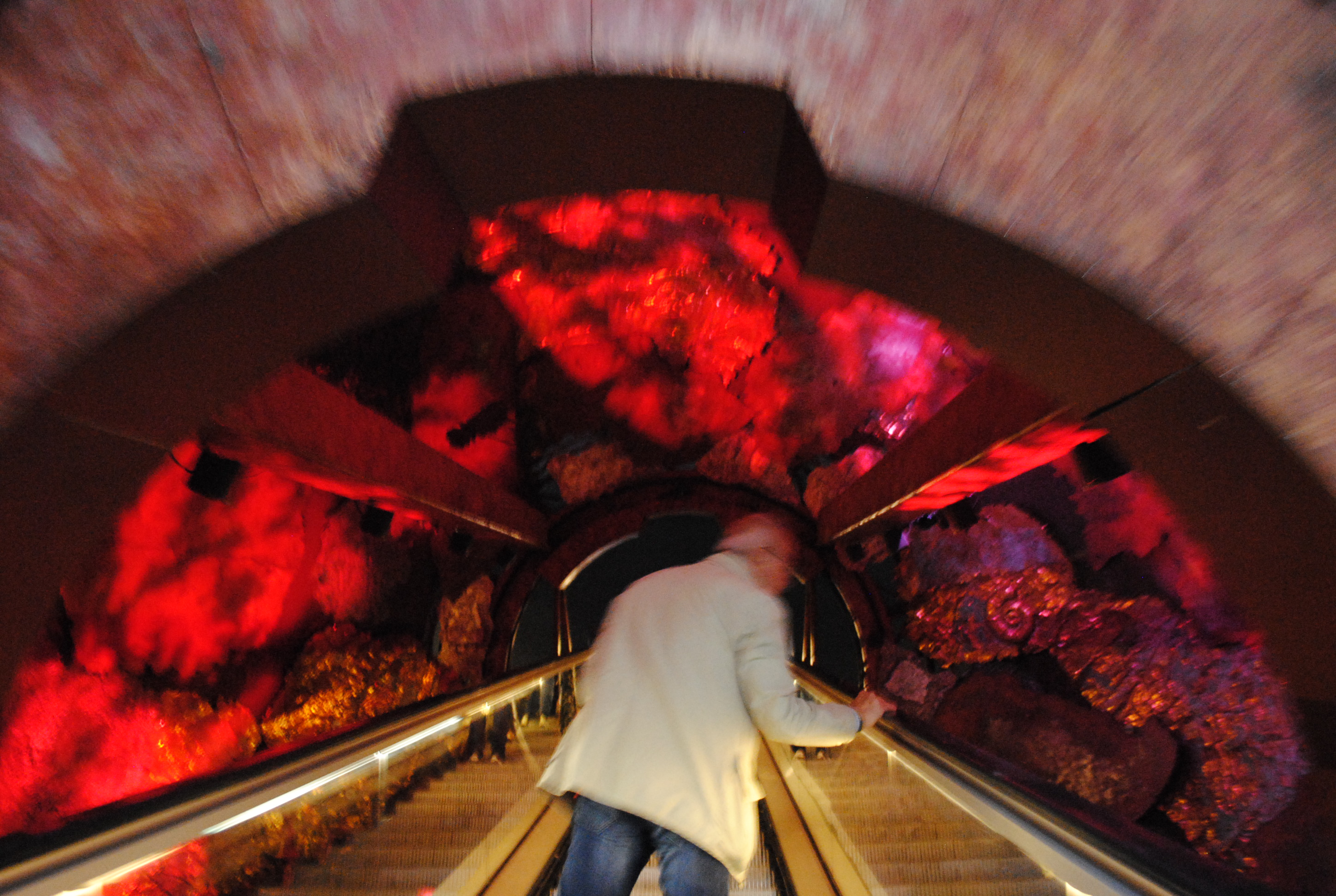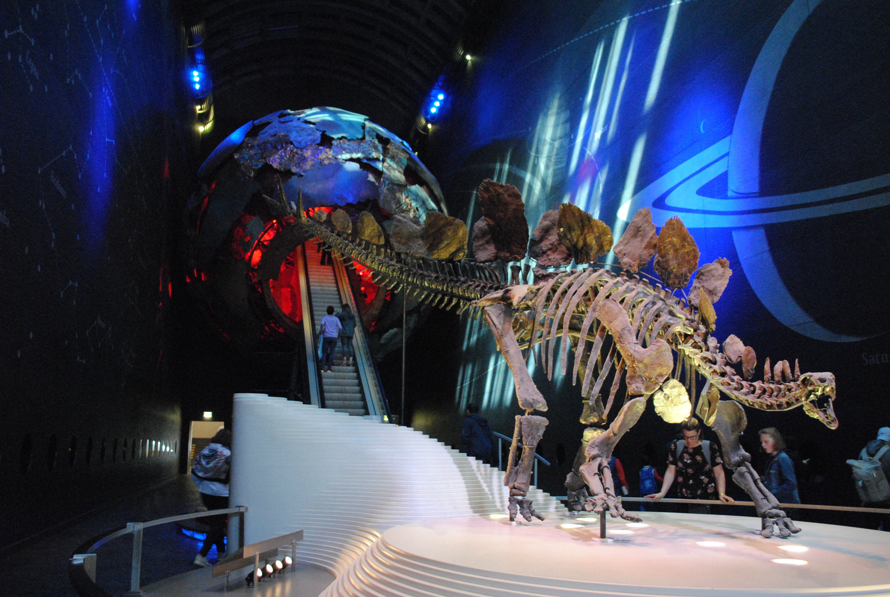 El museo es inmenso y una visita completa, incluyendo paradas para observar lo que hay, nos puede llevar algo más de 2 horas. Y si el tema nos apasiona, puede que estemos un poco más. Como hay muchos cambios de registros temáticos no se hace nada pesado. Tiene distintos puntos de entrada, pero nosotros optamos por la que da a la calle Exhibiton Road. El recibimiento no puede ser más espectacular, una sala con una iluminación tenue, unas paredes con constelaciones y una escalera mecánica que atraviesa un globo metálico rojo, como si de una figura espacial se tratase. Con este sencillo gesto, de composición, el museo te introduce en una de sus primeras zonas (la Red Zone). Esta primera parte del museo tiene un factor interactivo imprescindible, desde pantallas para construir tu propio volcán, hasta salas donde sentir un pequeño terremoto, ruedas para comprobar o distintas composiciones de los minerales.