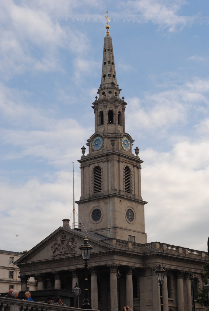 Finalmente se asoma la enorme plaza de Trafalgar Square. Es una plaza con mucha vida, en la que encontrarás turistas de todo el mundo, artistas callejeros, e incluso alguna que otra pieza de arte en forma de exposición temporal. Lo primero que llama la atención de esta plaza es la columna y los gigantescos leones; pero bien es cierto, que el edificio del National Gallery te atrae con la mirada. Otro atractivo de esta plaza es su vista directa hacia el Big Ben, que en nuestro caso, estaba cubierto de andamios y en obras. Junto a la National Gallery encontramos la iglesia St. Martin-in-the-Fields, anglicana, con un interior muy impresionante.